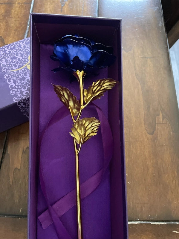 Your golden rose arrives nestled within a luxurious purple gift box, adorned with intricate white patterns and a delicate gold rose illustration. This elegant presentation ensures the unveiling of your gift is as enchanting and memorable as the rose itself, ready to inspire profound joy.